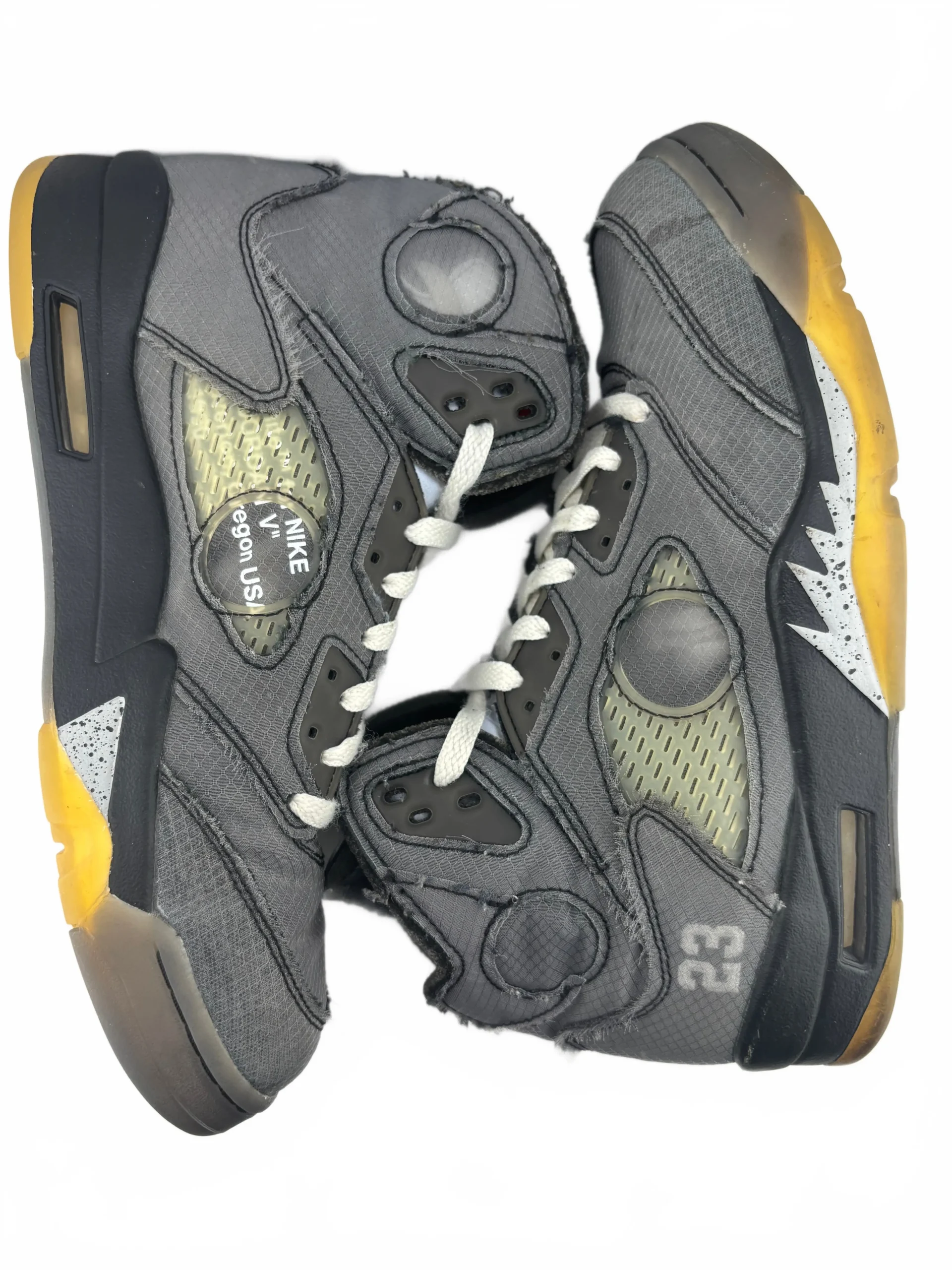 Virgil Abloh added a second Jordan silhouette to his series of Nike collaborations with the Jordan 5 Retro High Off-White Black, now available on StockX. This release pays homage to the first Jordan that Virgil ever owned, the Air Jordan 5 Black Metallic. In signature fashion, Virgil has reimagined this classic silhouette in a way that embraces the importance of Nike Air technology.